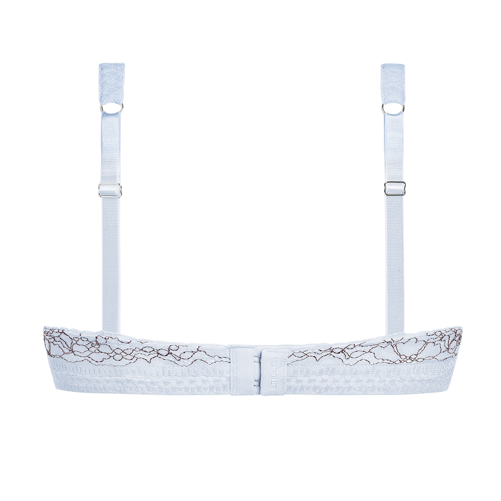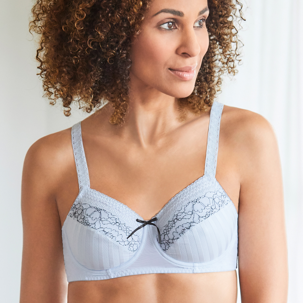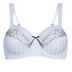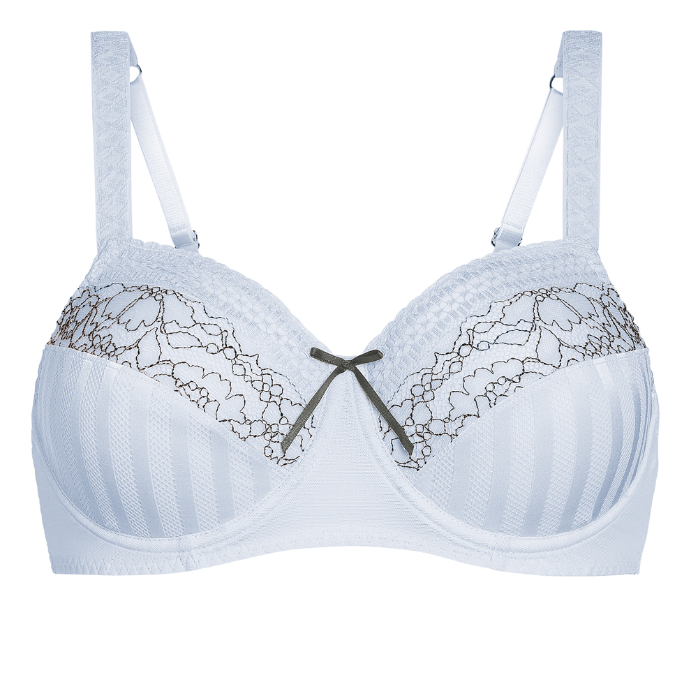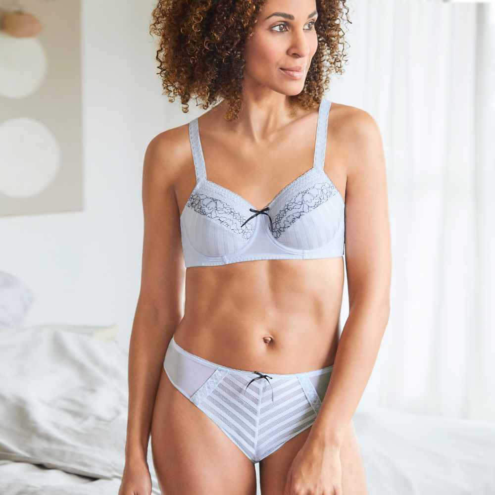 Evelina bøjle BH er en smuk lyseblå/grå BH med moderne blonde og feminine striber